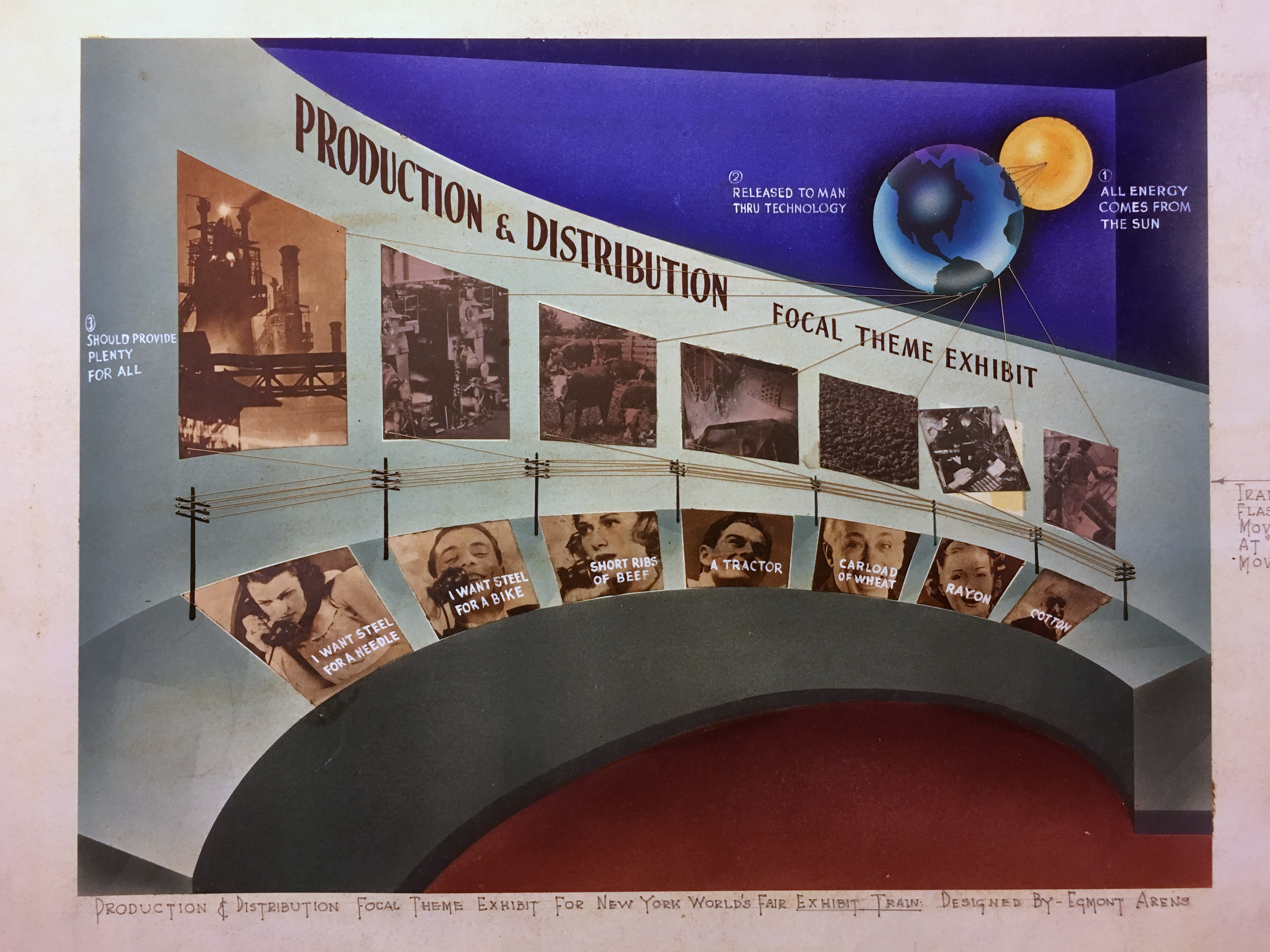 Egmont Arens,(5) whose illustrated comps for Fair exhibits stand out in the NYPL archive, was a multi-faceted industrial designer who specialized in product design, packaging, and marketing, and is recognized as the father of planned obsolescence (6)—matching perfectly with Bernays’ appeals to the desires of the American citizen, satisfying their wants beyond merely providing for their needs. With the persuasive tactics of both Bernays’ public relations and Arens’ product design, display, and distribution, the groundwork was established for corporate branding and accelerated consumer consumption.