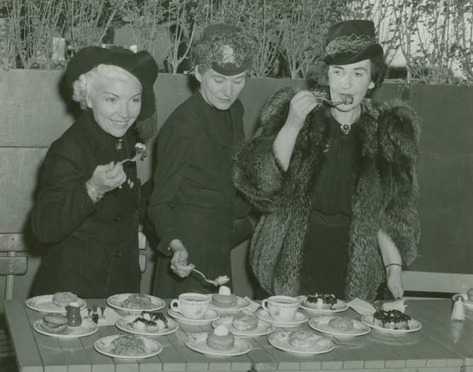 Women ‘workers’ testing and packaging latex gloves at the Firestone exhibit; model secretarial stations in the Town of Tomorrow exhibit; women ‘judges’ at a Doughnut contest; two models lunch in the ‘World of Models’ fashion area.