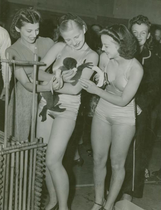 Public relations men and event organizers cast women largely as sideshow attraction. Leo Casey, Director of Public Relations for the Fair writes: The monkeys just can’t stay away from the Aquacade. Some half dozen of the elusve simians have taken refuge in the warmth of Billy Rose’s Aquacade at the New York World’s Fair. Jungle-Master Frank Buck, from whom the monkeys escaped, set traps in the Aquacade, and were captured. One is shown here with the Aquagals.